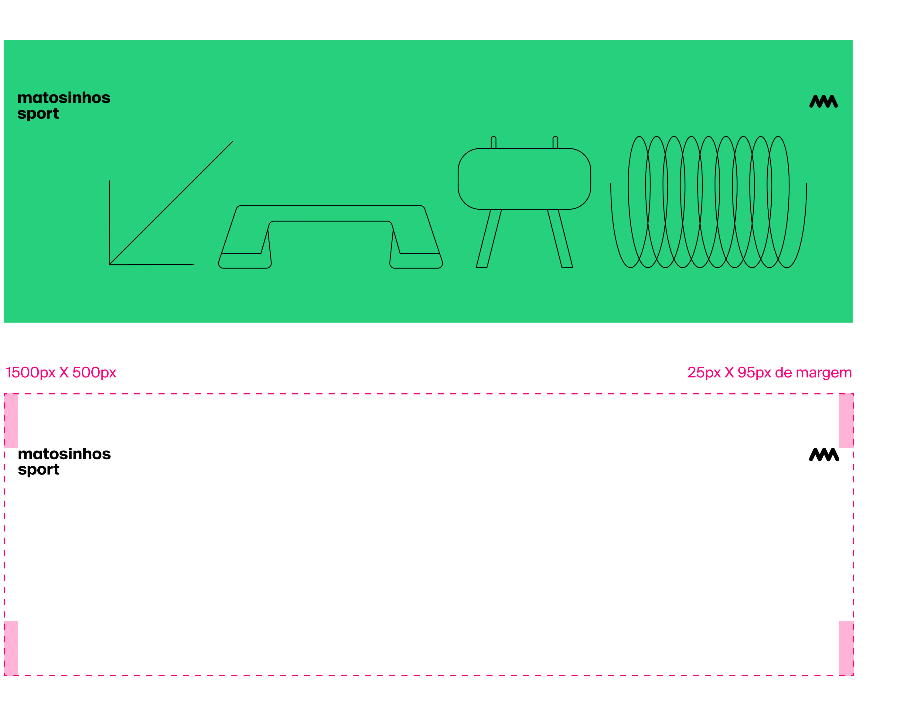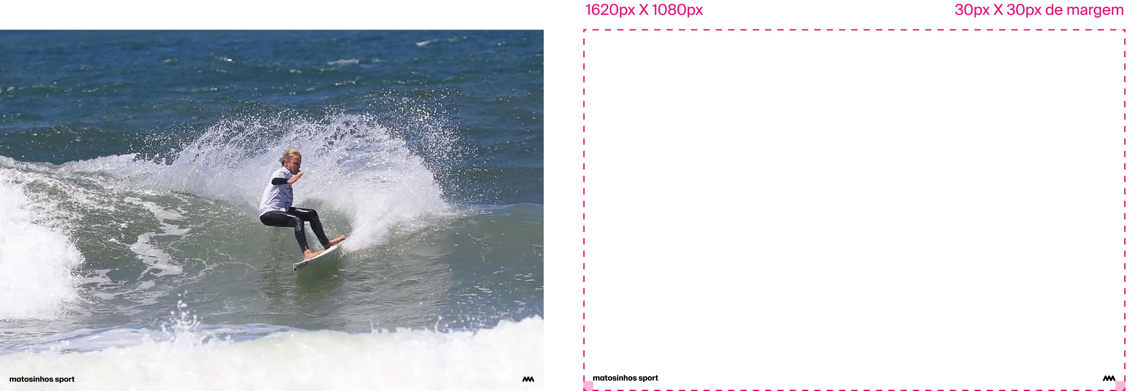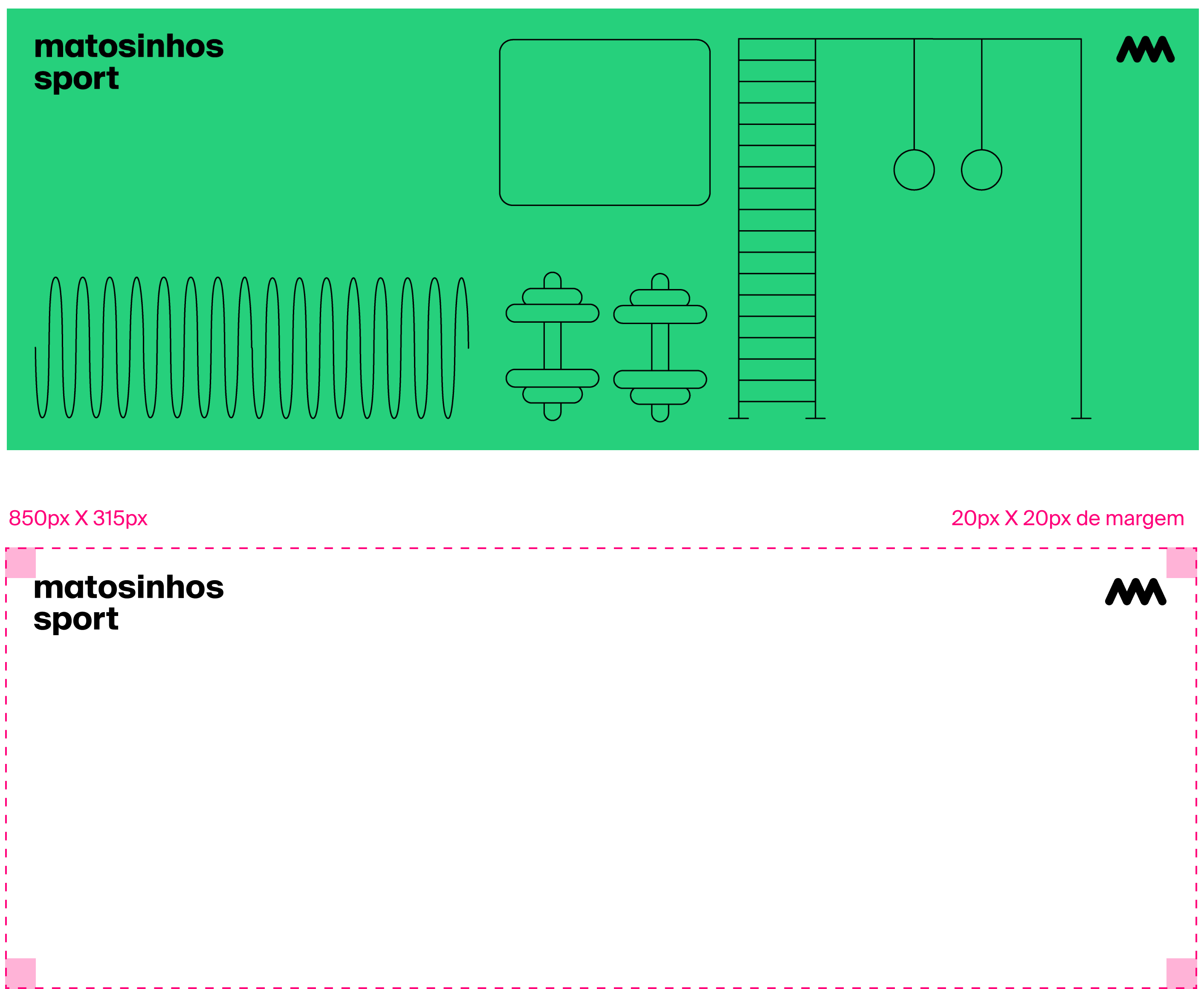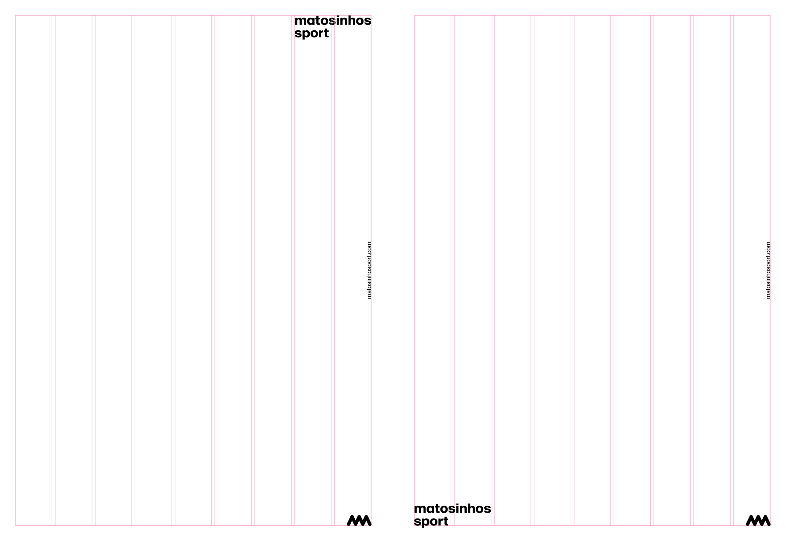 Utilizar a versão de 1 linha do logotipo da Matosinhos Sport no canto inferior esquerdo e o “M” no canto inferior direito. O tamanho deverá ser utilizado de acordo com o template. Usar versão positiva ou negativa conforme a imagem a que a marca de água será aplicada, de forma a garantir o contraste entre o logotipo e o fundo.