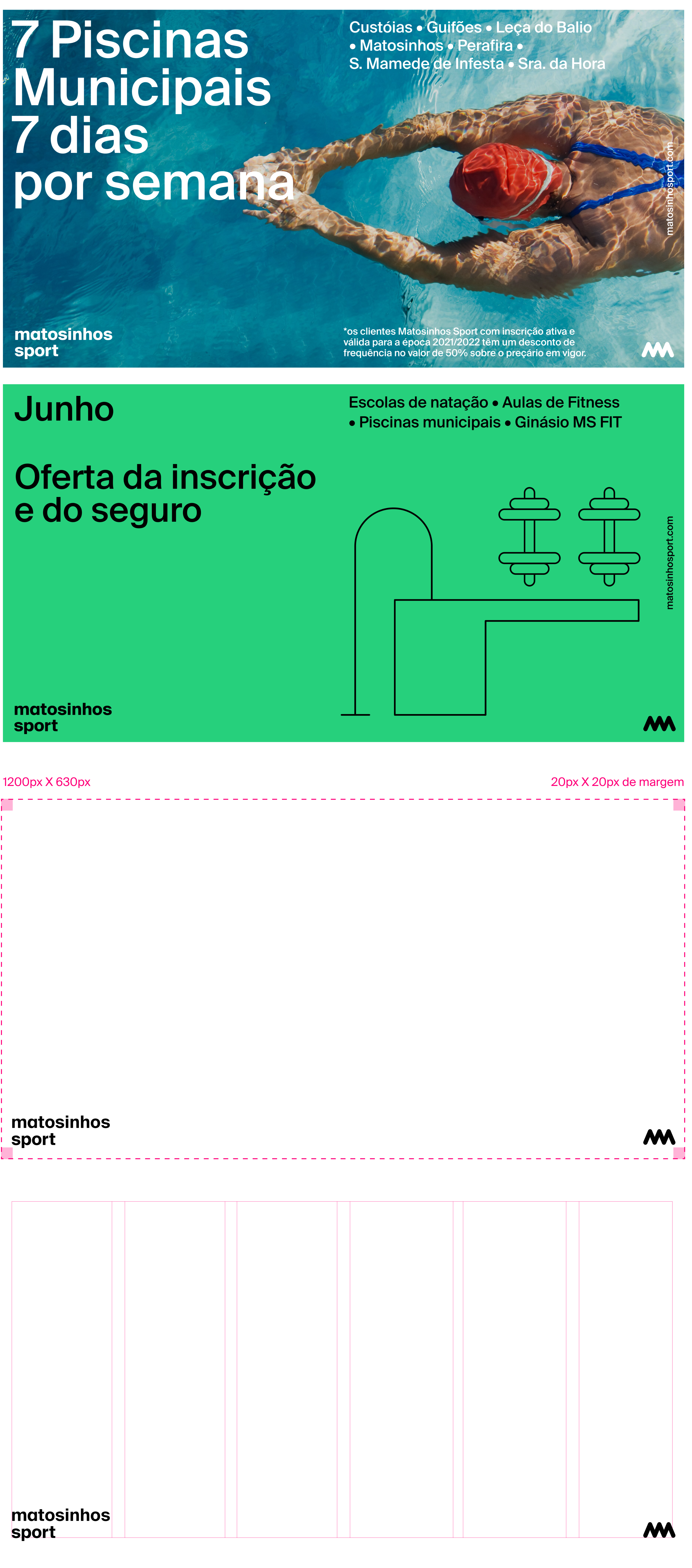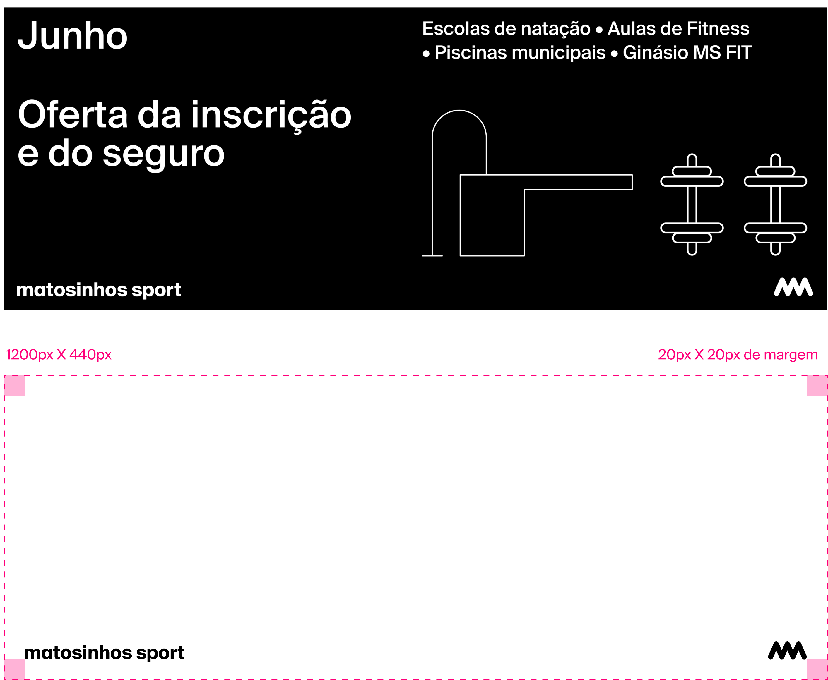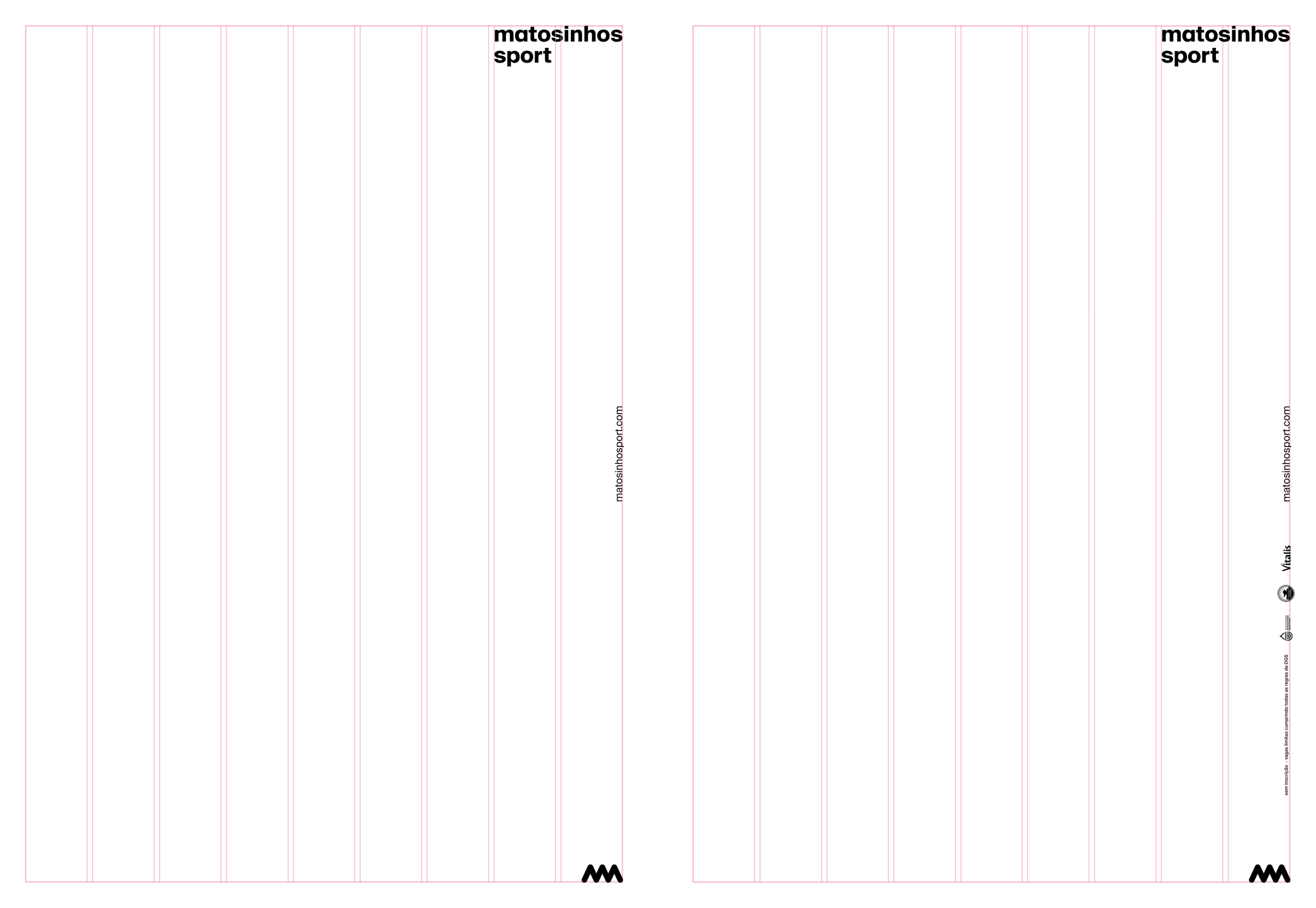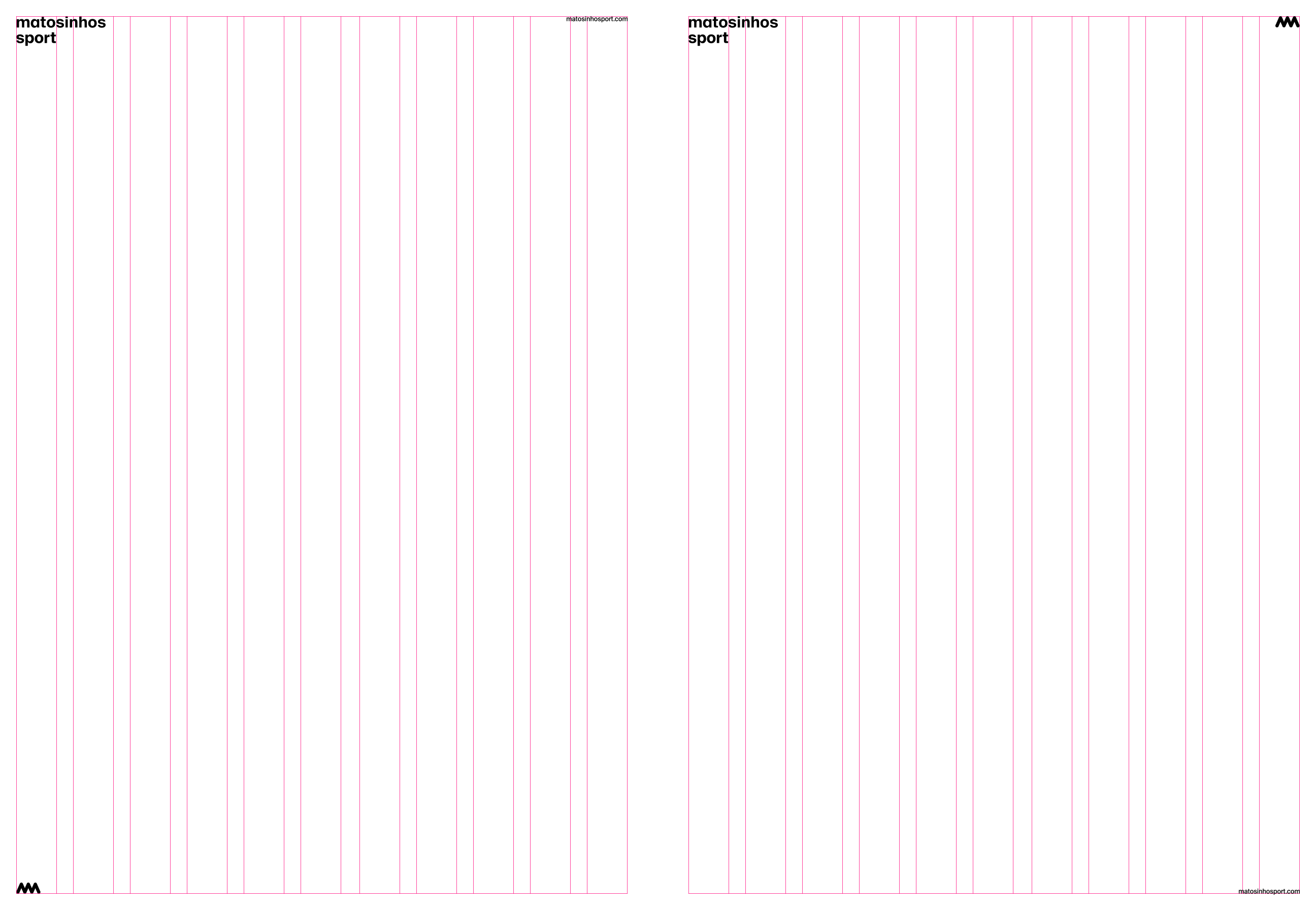 Utilizar a versão de 1 linha do logotipo da Matosinhos Sport no canto inferior esquerdo e o “M” no canto inferior direito. O tamanho deverá ser utilizado de acordo com o template. Usar versão positiva ou negativa conforme a imagem a que a marca de água será aplicada, de forma a garantir o contraste entre o logotipo e o fundo.
