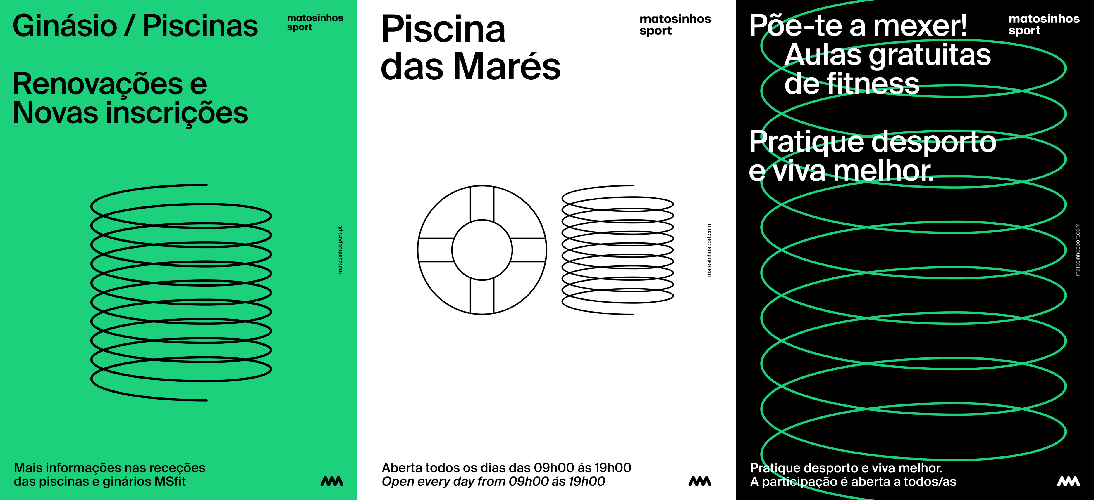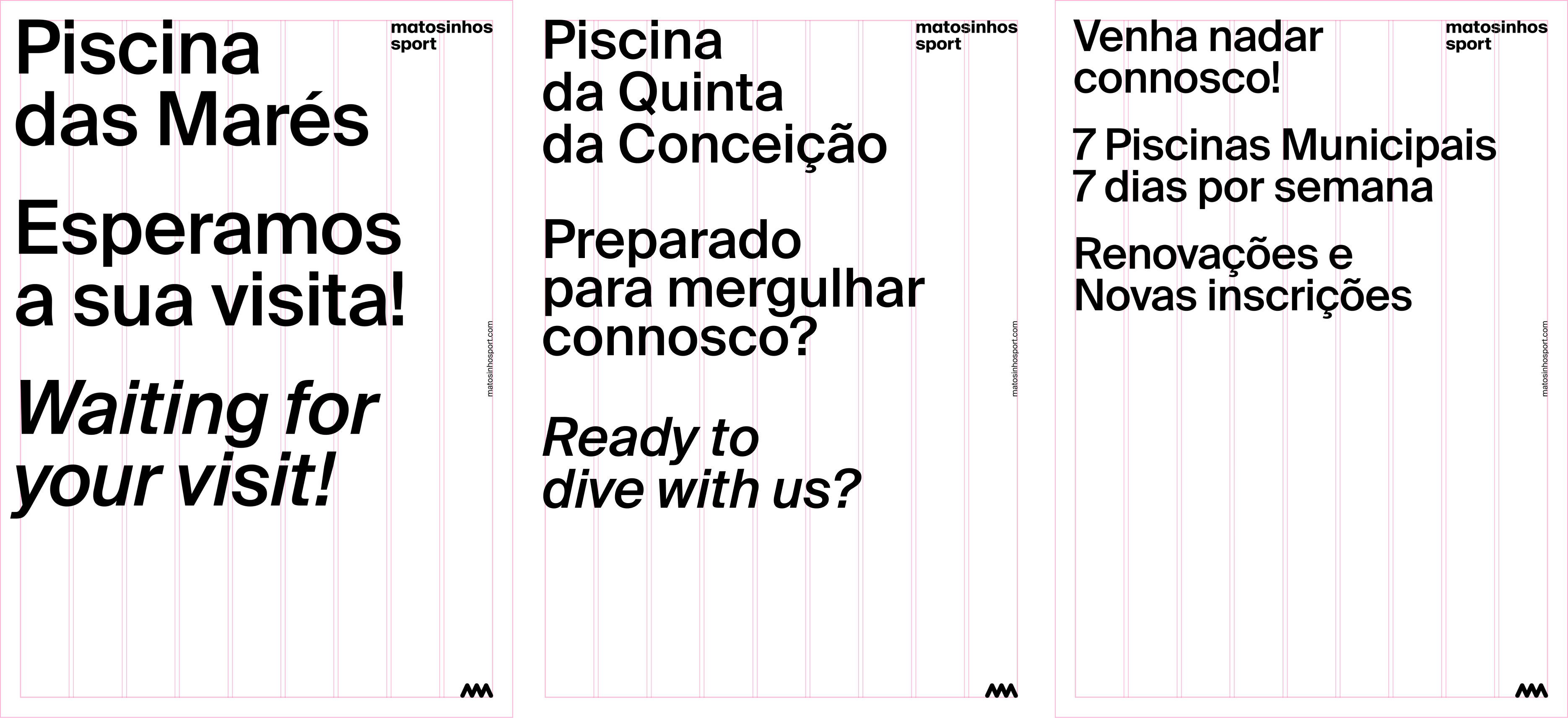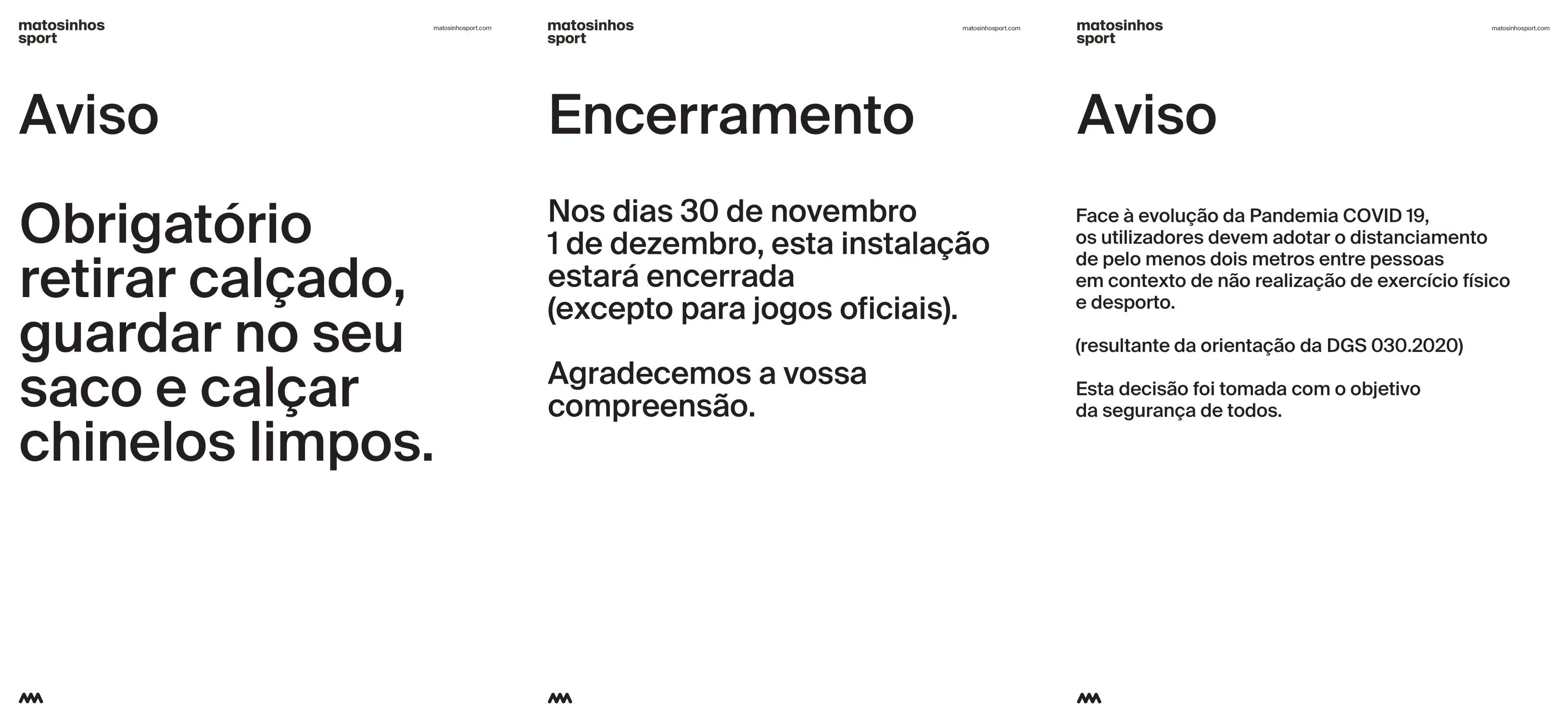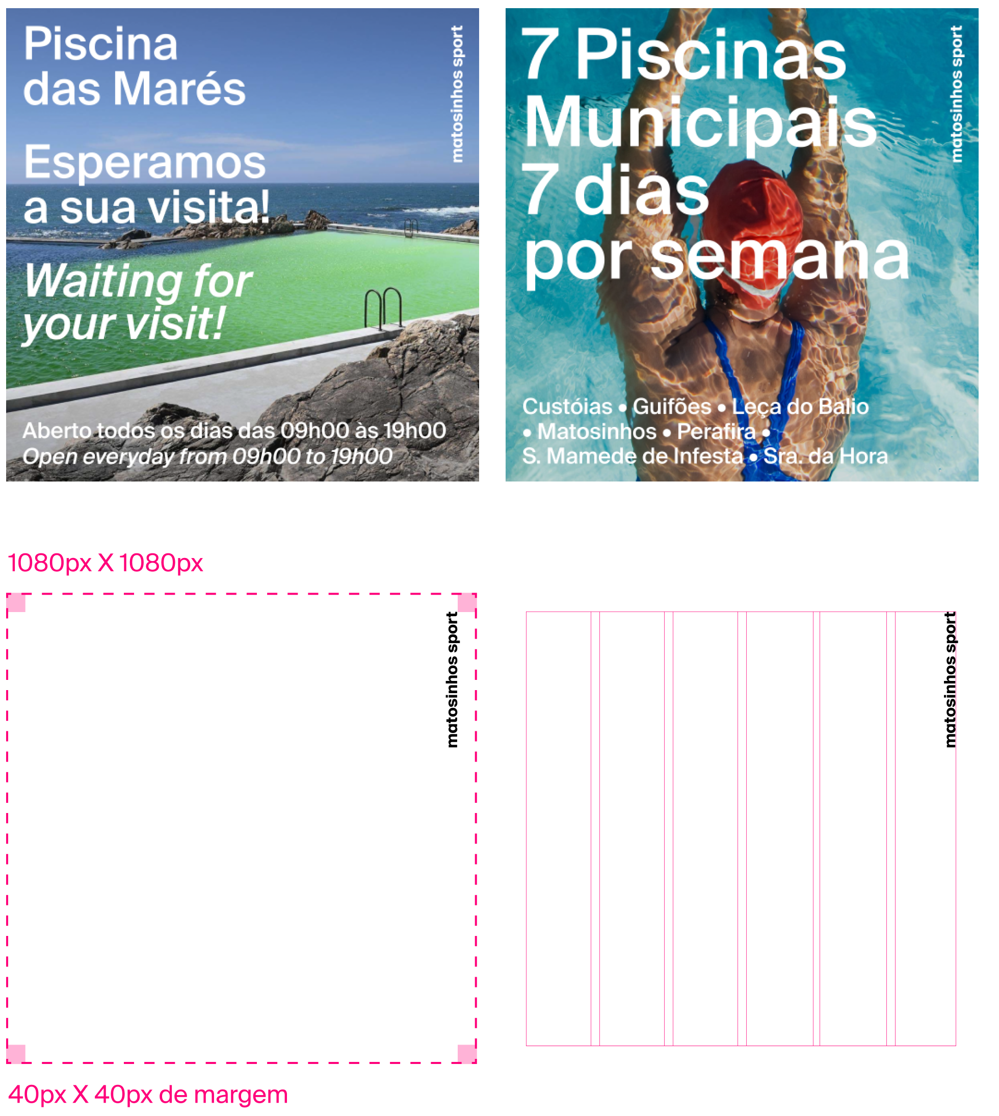 Utilizar a versão de 1 linha do logotipo da Matosinhos Sport no canto inferior esquerdo e o “M” no canto inferior direito. O tamanho deverá ser utilizado de acordo com o template. Usar versão positiva ou negativa conforme a imagem a que a marca de água será aplicada, de forma a garantir o contraste entre o logotipo e o fundo.