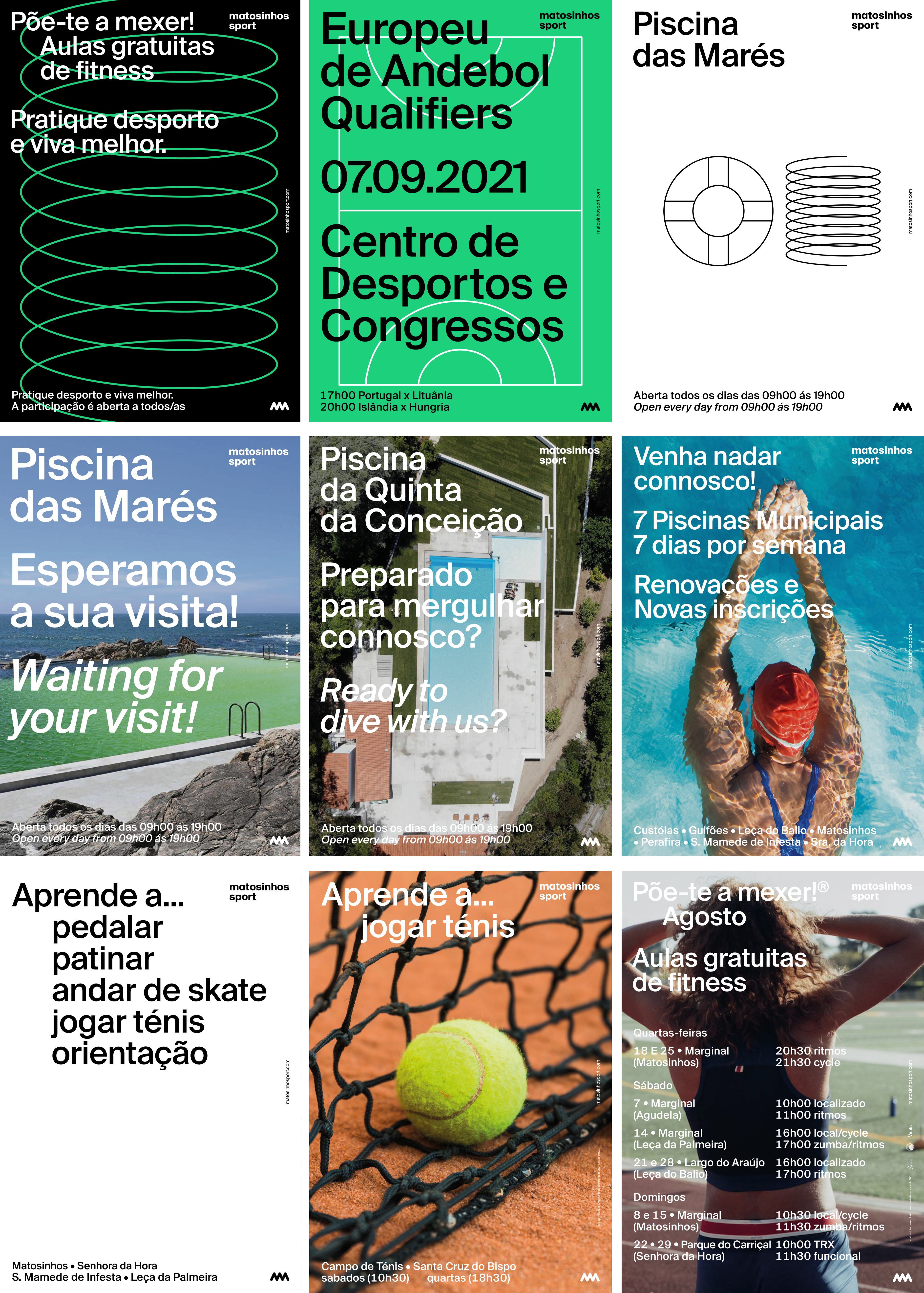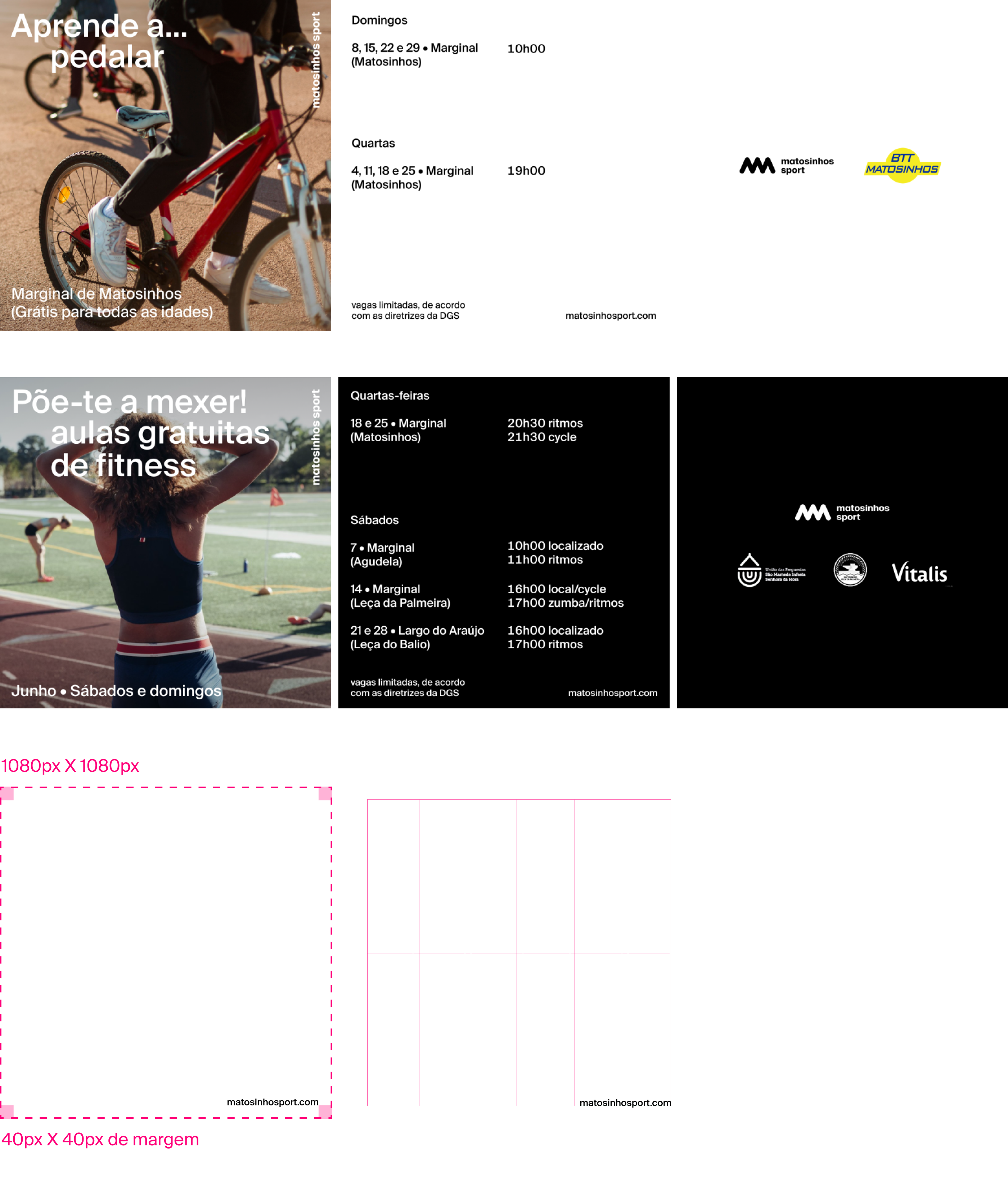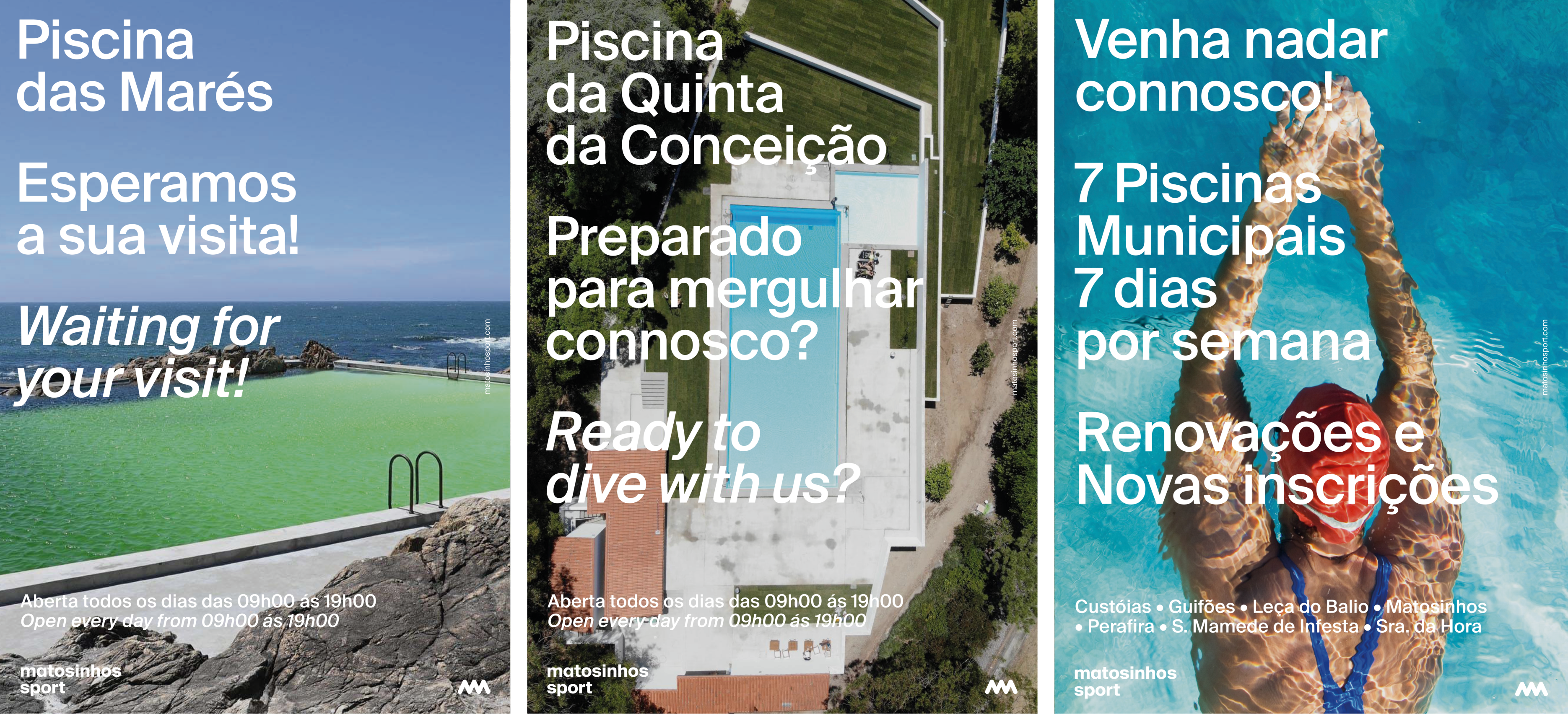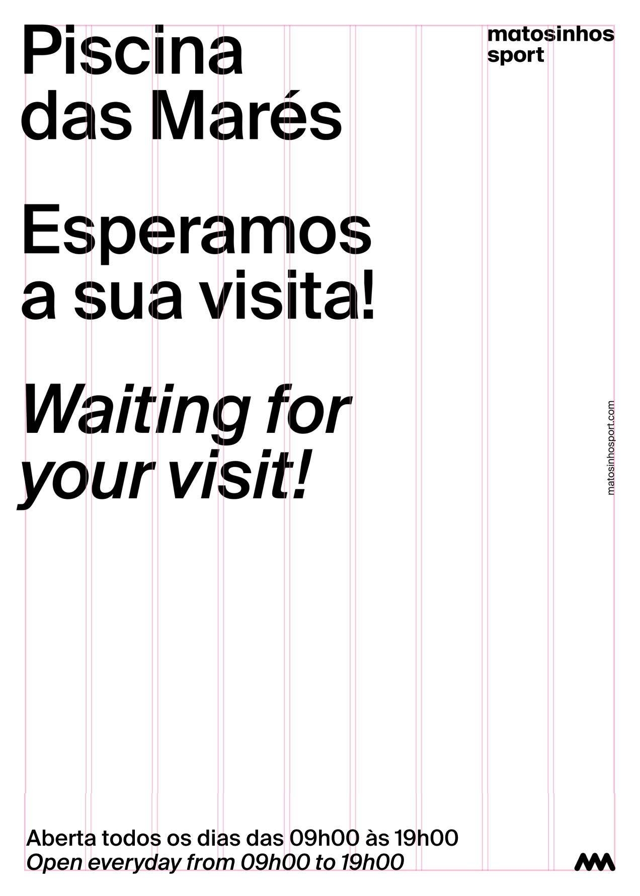 Utilizar a versão de 1 linha do logotipo da Matosinhos Sport no canto inferior esquerdo e o “M” no canto inferior direito. O tamanho deverá ser utilizado de acordo com o template. Usar versão positiva ou negativa conforme a imagem a que a marca de água será aplicada, de forma a garantir o contraste entre o logotipo e o fundo.