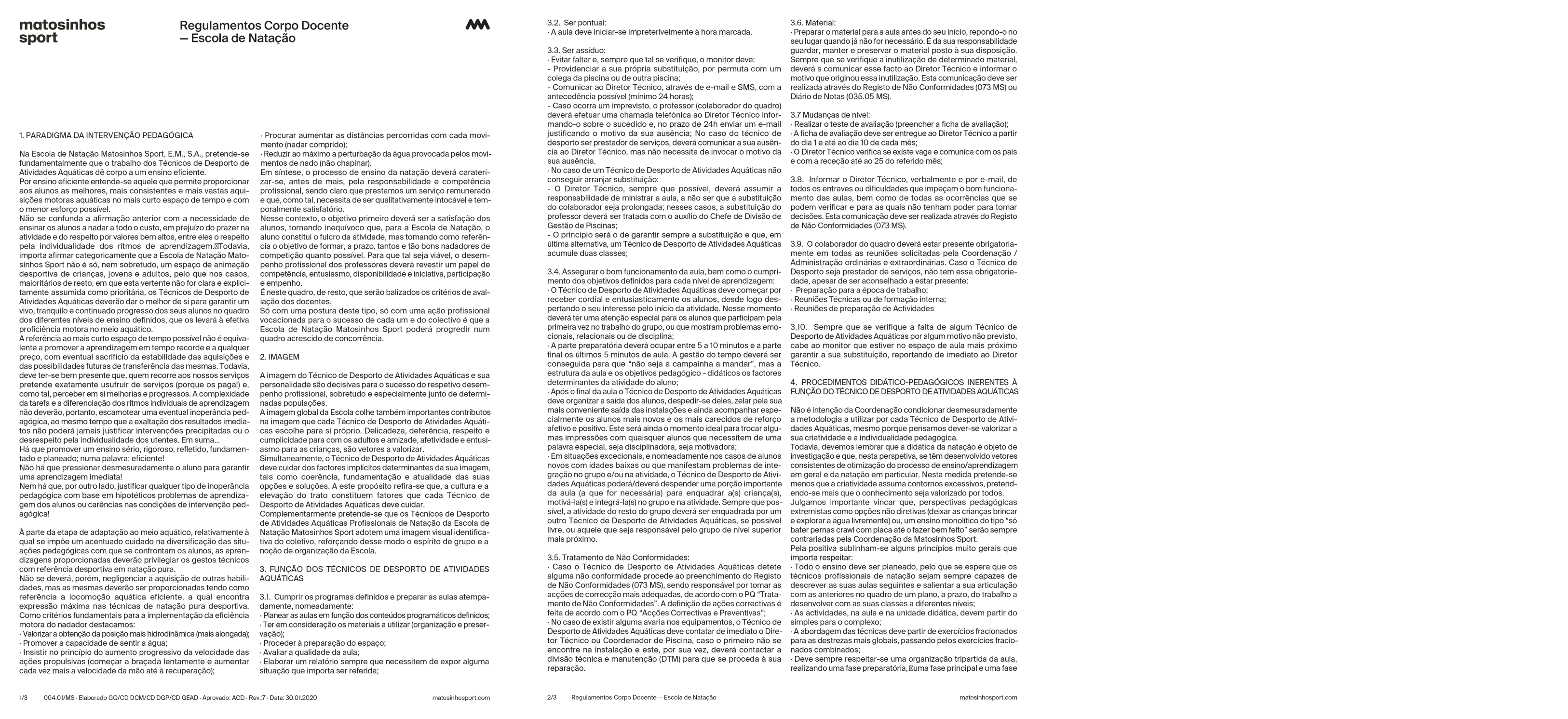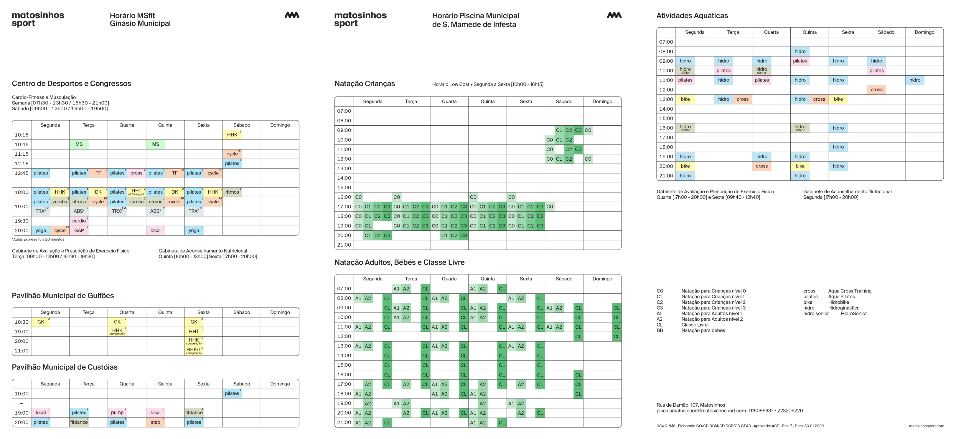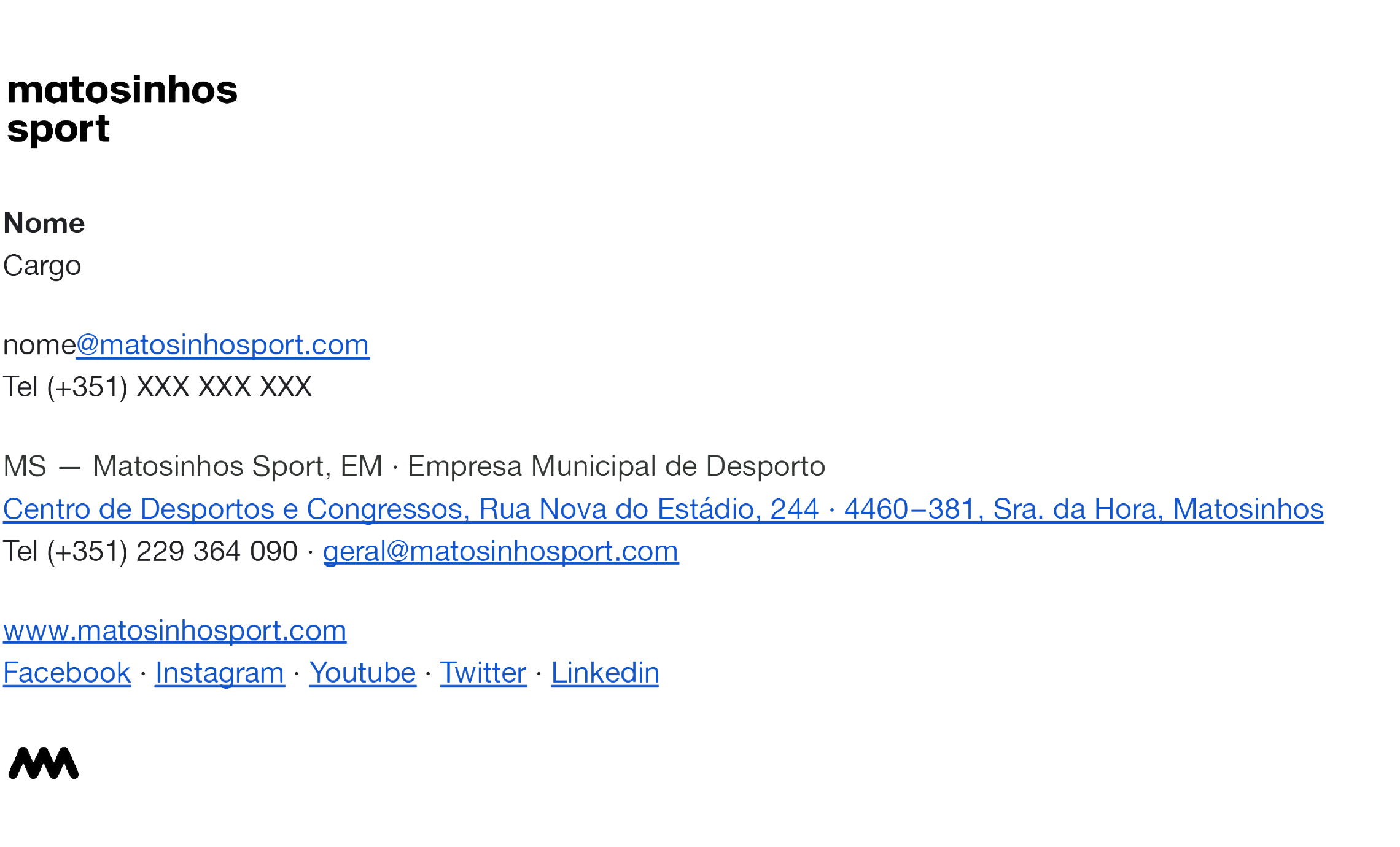 Utilizar sempre o logotipo da Matosinhos Sport como cabeçalho. De seguida, colocar a informação do funcionário (em que apenas o nome estará a bold). Logo depois, temos a informação de contacto da sede da empresa, seguida dos links de acesso às plataformas digitais. Por fim, assinar com o “M” referente à Câmara Municipal de Matosinhos.