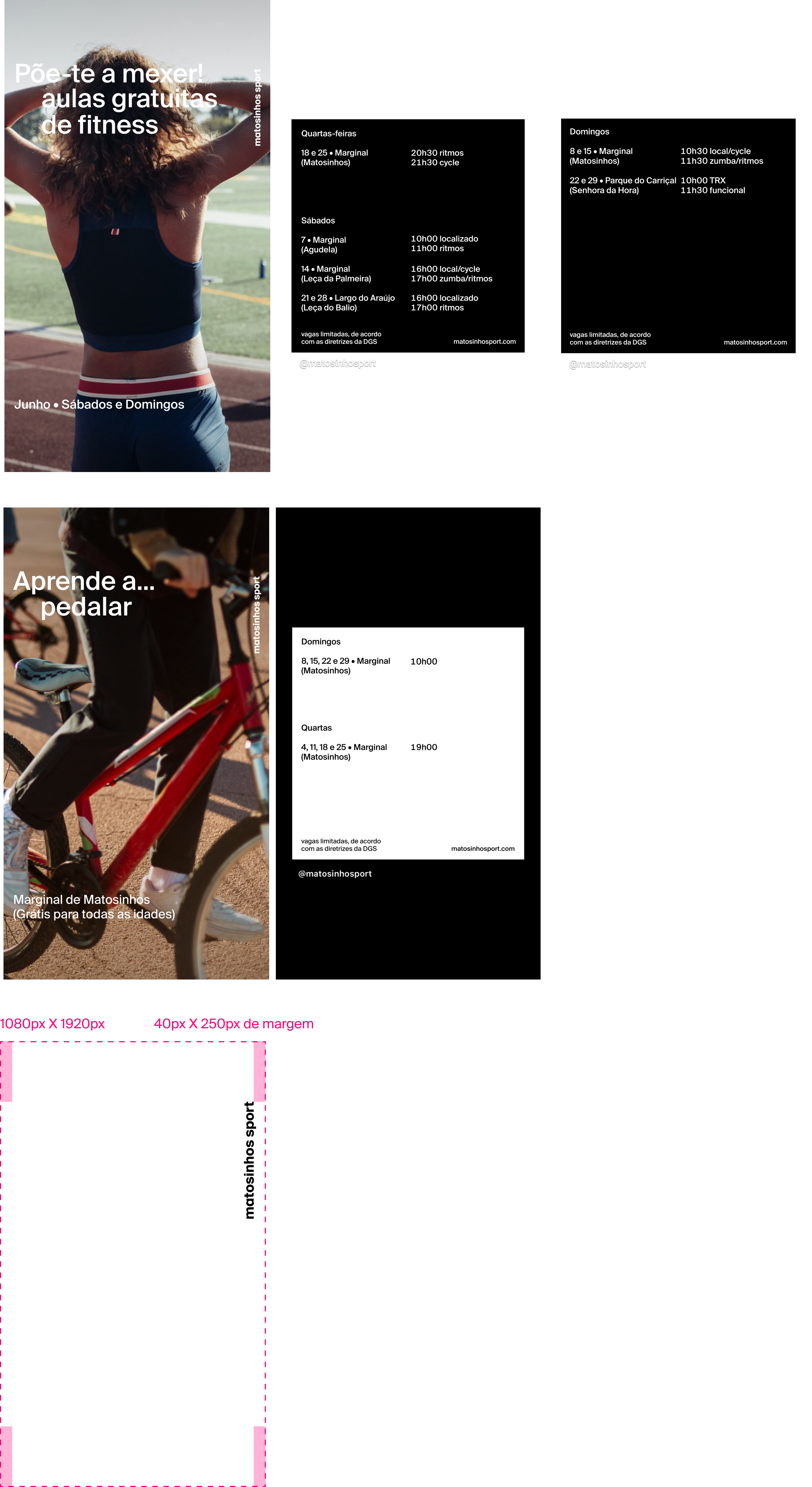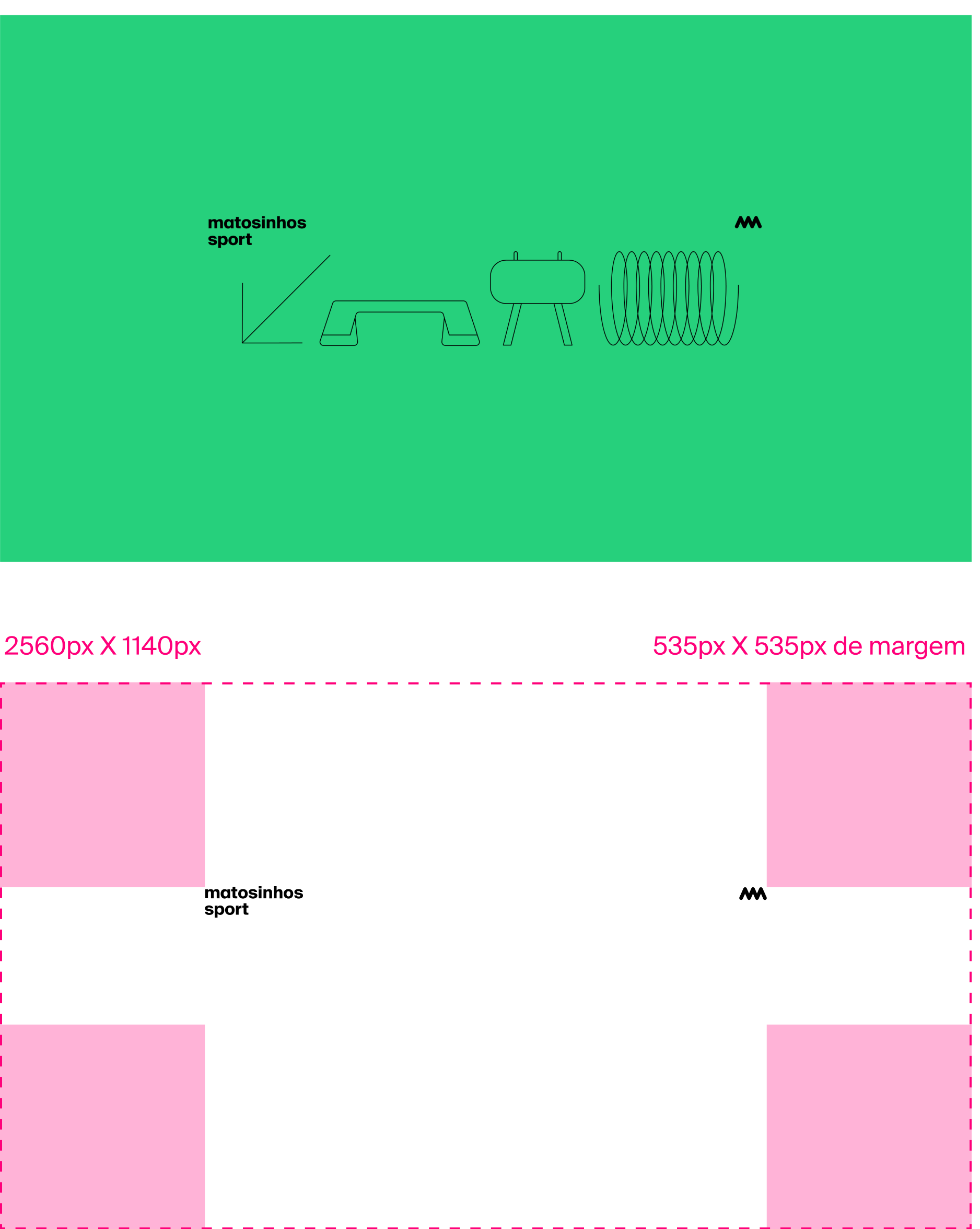 Utilizar a versão de 1 linha do logotipo da Matosinhos Sport no canto inferior esquerdo e o “M” no canto inferior direito. O tamanho deverá ser utilizado de acordo com o template. Usar versão positiva ou negativa conforme a imagem a que a marca de água será aplicada, de forma a garantir o contraste entre o logotipo e o fundo.